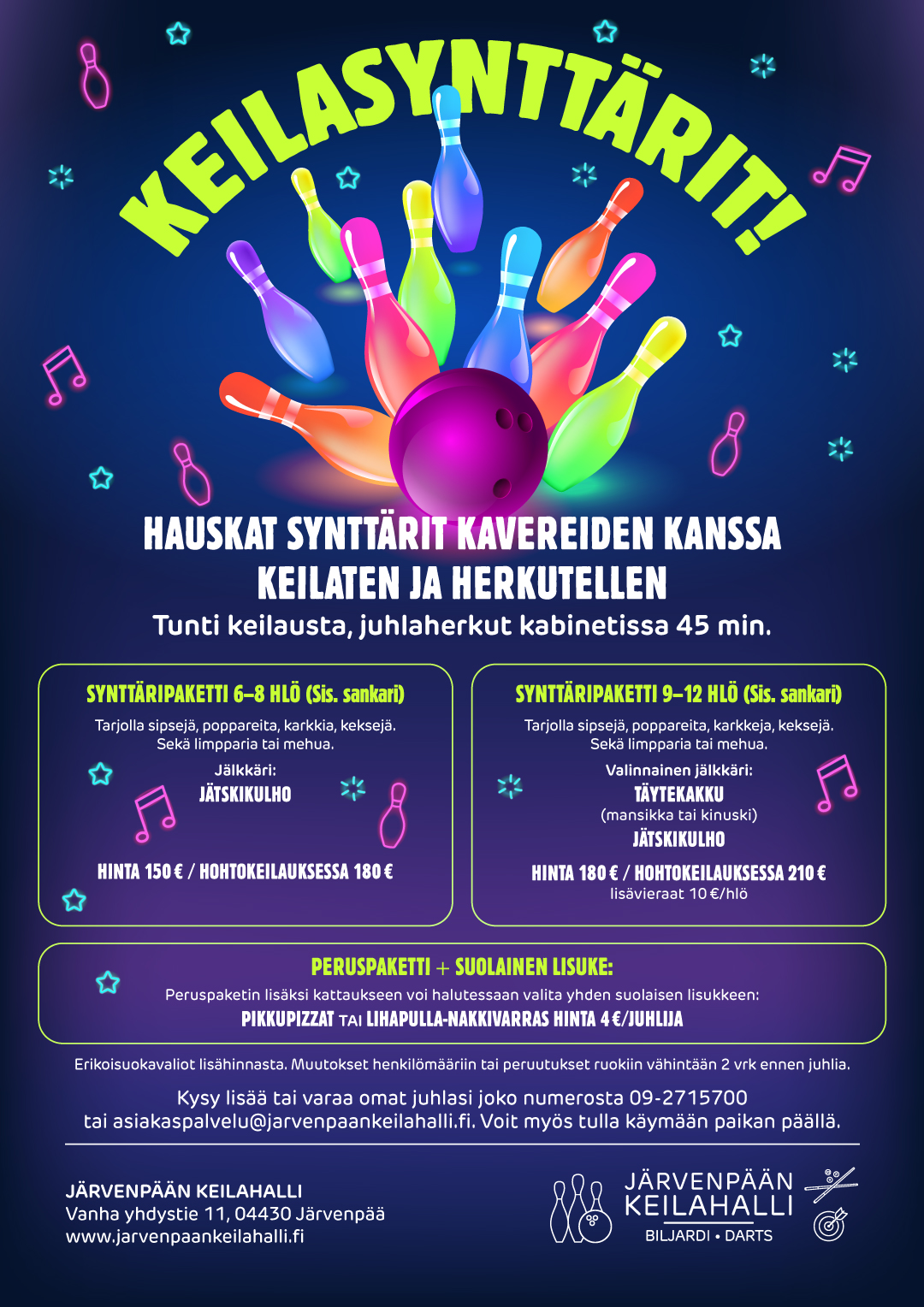 Järjestämme myös aikuisille syntymäpäiväjuhlia. Räätälöimme kaikille sopivan ja oman näköisen paketin esim. keilailusta, ruokailusta ja saunomisesta. Kysy lisää!